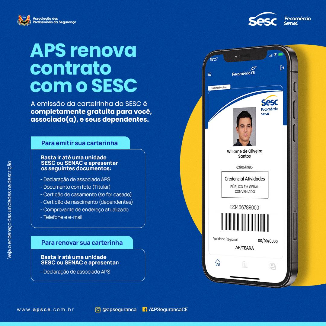 A emissão da carteirinha do SESC é completamente gratuita para você, associado(a), e seus dependentes. Aproveite essa parceria e garanta já a sua carteirinha gratuitamente.✅ JÁ TENHO A CARTEIRINHA, COMO FAÇO?Se já possui a carteirinha, basta realizar a renovação. Para isso, dirija-se a uma unidade do SESC ou SENAC com a declaração de associado(a) da APS.✅ NÃO TENHO A CARTEIRINHA, COMO FAÇO?Com a declaração de associado em mãos, junto com a certidão de casamento (se for casado(a)), certidão de nascimento (dependentes), documento com foto, comprovante de endereço atualizado, contato e e-mail, vá a uma unidade do SESC ou SENAC.✅ COMO FAÇO PARA RECEBER A DECLARAÇÃO DE ASSOCIADO(A)?Solicite a declaração de associado da APS de duas formas:Enviando um e-mail para recepcao@apsce.com.br com o assunto “Declaração para Carteirinha do SESC.”Entrando em contato pelo WhatsApp da Central: (85) 9 8880.2839 e solicitando a declaração.👉🏻 UNIDADES DO SESC:Rua Clarindo de Queiroz, nº 1740, Centro, Fortaleza (CE)Rua João Cordeiro, nº 933, Aldeota, Fortaleza (CE)Av. Dom Almeida Lustosa, nº 550, Parque Albano, Caucaia (CE)Rua André Cartaxo, nº 443, São Miguel, Crato (CE)Rua da Matriz, nº 227, Centro, Juazeiro do Norte (CE)Rua Boulevard João Barbosa, nº 902, Centro, Sobral (CE)Rua 13 de Maio, nº 1130, Centro, Iguatu (CE)Rua Pedro Pessoa, nº 4401, 8 de Setembro (Prédio Art Club), Tabuleiro do Norte (CE)👉🏻 UNIDADES DO SENAC:Av. Tristão Gonçalves, nº 1245, Centro, Fortaleza (CE)Av. Presidente Castelo Branco, nº 203, Moura Brasil, Fortaleza (CE) – (Senac Panorama – Escola de Gastronomia)Av. Desembargador Moreira, nº 1301, Aldeota, Fortaleza (CE)Piso L2 – Shopping RioMar, Rua Des. Lauro Nogueira, nº 1500, Papicu, Fortaleza (CE)Rua Pedro Brasil, nº 210, Centro, Aquiraz (CE)Praça da Sé, nº 596, Centro, Crato (CE)Rua 13 de Maio, nº 1134, Centro, Iguatu (CE)Rua Coronel Manoel Paula, nº 175, Centro, Maranguape (CE)Rua Adauto Castelo, nº 222, Centro, Cedro (CE)Rua Éubia Barroso, nº 2959, sala 24, Shopping Clacita, Centro, Itapipoca (CE).