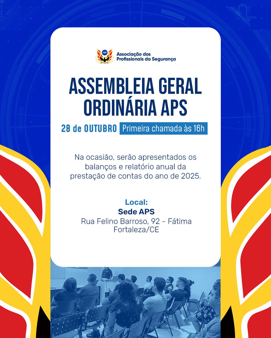 O Diretor Presidente da Associação dos Profissionais da Segurança (APS), no uso de suas atribuições estatutárias e em atendimento ao disposto no inciso I do art. 26 do Estatuto Consolidado da APS, CONVOCA, para o próximo dia 28 de outubro de 2025, com primeira chamada às 16h, todos os seus associados para estarem presentes na ASSEMBLEIA GERAL ORDINÁRIA DA APS, que será realizada na sede da entidade, situada na Rua Felino Barroso, 92 – Fátima – Fortaleza, a serem abordadas as seguintes pautas: