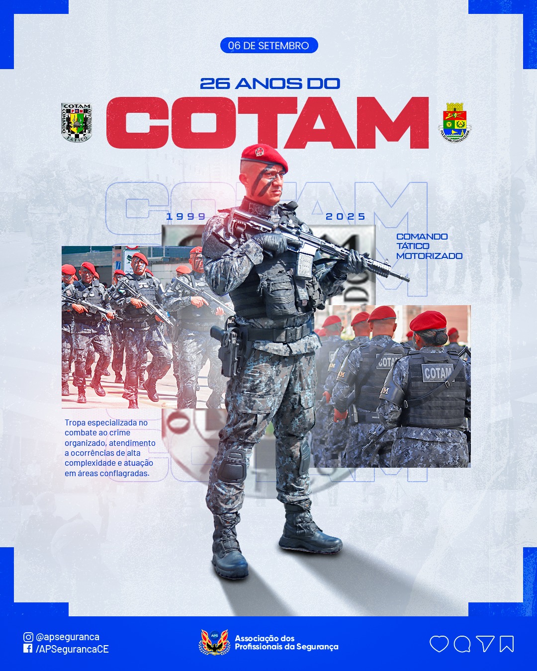 Há 26 anos, desde a sua criação em 6 de setembro de 1999, o Comando Tático Motorizado (Cotam) da Polícia Militar do Ceará (PMCE) atua na linha de frente do enfrentamento à criminalidade. Reconhecido pela pronta resposta e pela ação estratégica, o Cotam é referência no combate ostensivo e na preservação da ordem pública em todo o Estado.