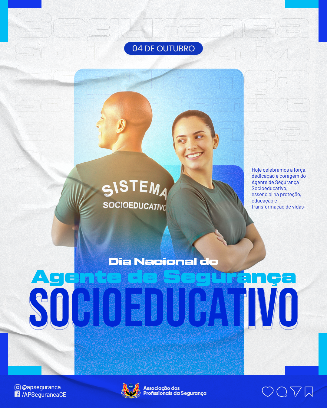 Hoje, a Associação dos Profissionais da Segurança (APS) reconhece o trabalho dos agentes de segurança socioeducativos, profissionais que exercem uma missão desafiadora e, ao mesmo tempo, essencial: garantir a ordem, a segurança e o cuidado com jovens em processo de ressocialização. Com disciplina, coragem e dedicação, esses agentes são pilares fundamentais na construção de um futuro mais justo e humano.