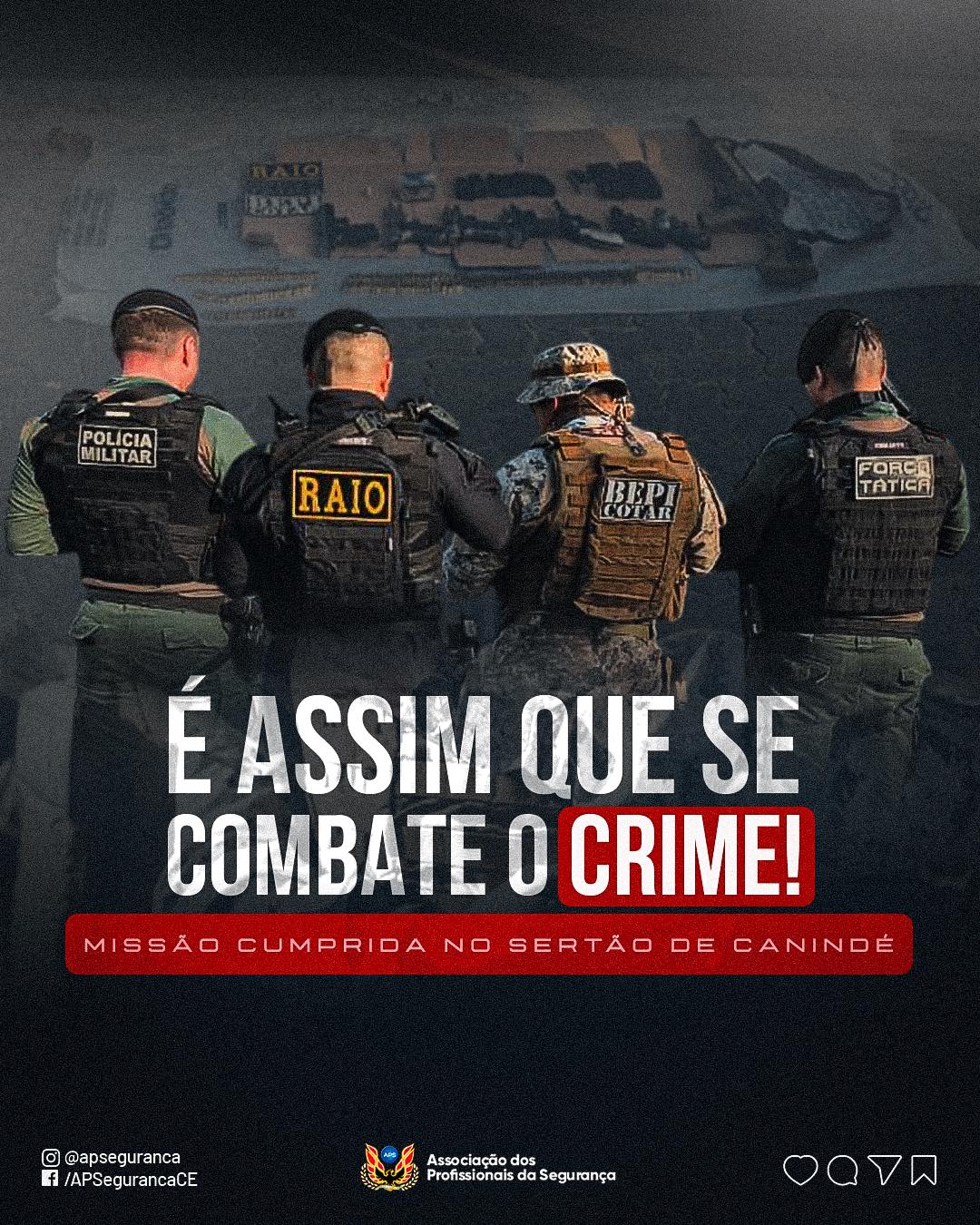 A Associação dos Profissionais da Segurança (APS) parabeniza a atuação exemplar dos policiais militares em Canindé, que resultou na apreensão de três pistolas, três revólveres e um fuzil. Na ação, sete faccionados foram mortos.