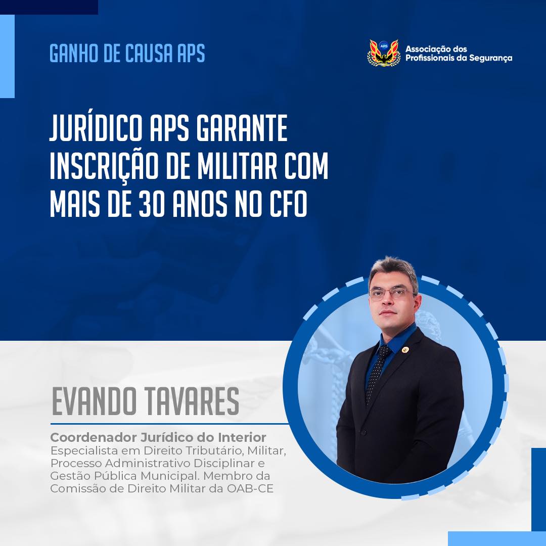 O setor jurídico da Associação dos Profissionais da Segurança (APS), por meio do coordenador jurídico de Interior, Evando Tavares, garantiu na Justiça o direito de um associado com 31 anos participar do Curso de Formação de Oficiais (CFO) do Corpo de Bombeiros Militar do Ceará (CBMCE). A Justiça suspendeu a cláusula de barreira etária prevista no edital do CFO do CBMCE, que limitava a idade dos candidatos a 29 anos, 11 meses e 29 dias.