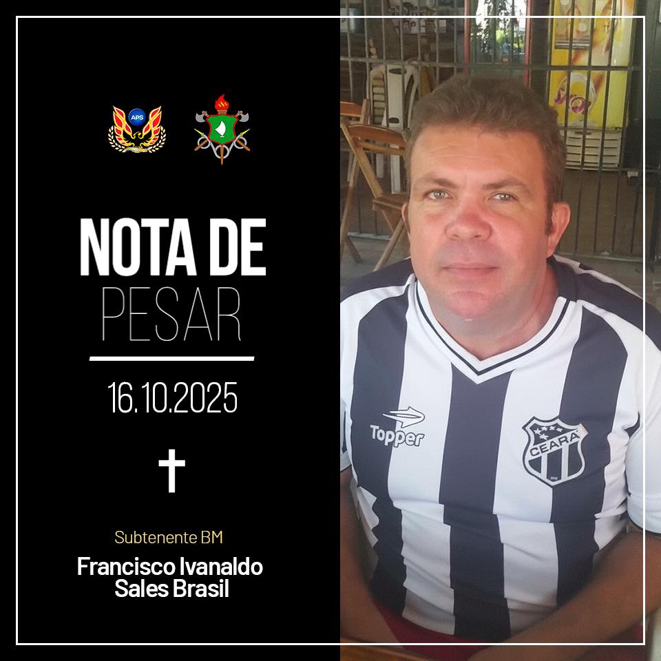 A Associação dos Profissionais da Segurança (APS) lamenta profundamente o falecimento do associado e subtenente do Corpo de Bombeiros Militar do Ceará (CBMCE), Francisco Ivanaldo Sales Brasil, ocorrido na última quinta-feira (16).