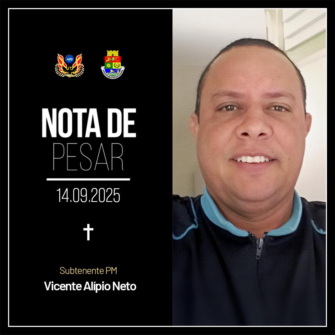 A Associação dos Profissionais da Segurança (APS) lamenta profundamente o falecimento do Subtenente Vicente Alípio Neto, da Polícia Militar do Ceará (PMCE), ocorrido no dia 14 de setembro.Um guerreiro que dedicou sua vida à segurança da sociedade e que, infelizmente, nos deixou. Neste momento de dor, expressamos nossas mais sinceras condolências aos familiares, amigos e irmãos de farda. Que Deus conceda conforto e força a todos que sentirão sua ausência.Descanse em paz, guerreiro. Sua dedicação e legado permanecerão para sempre na memória de todos nós.