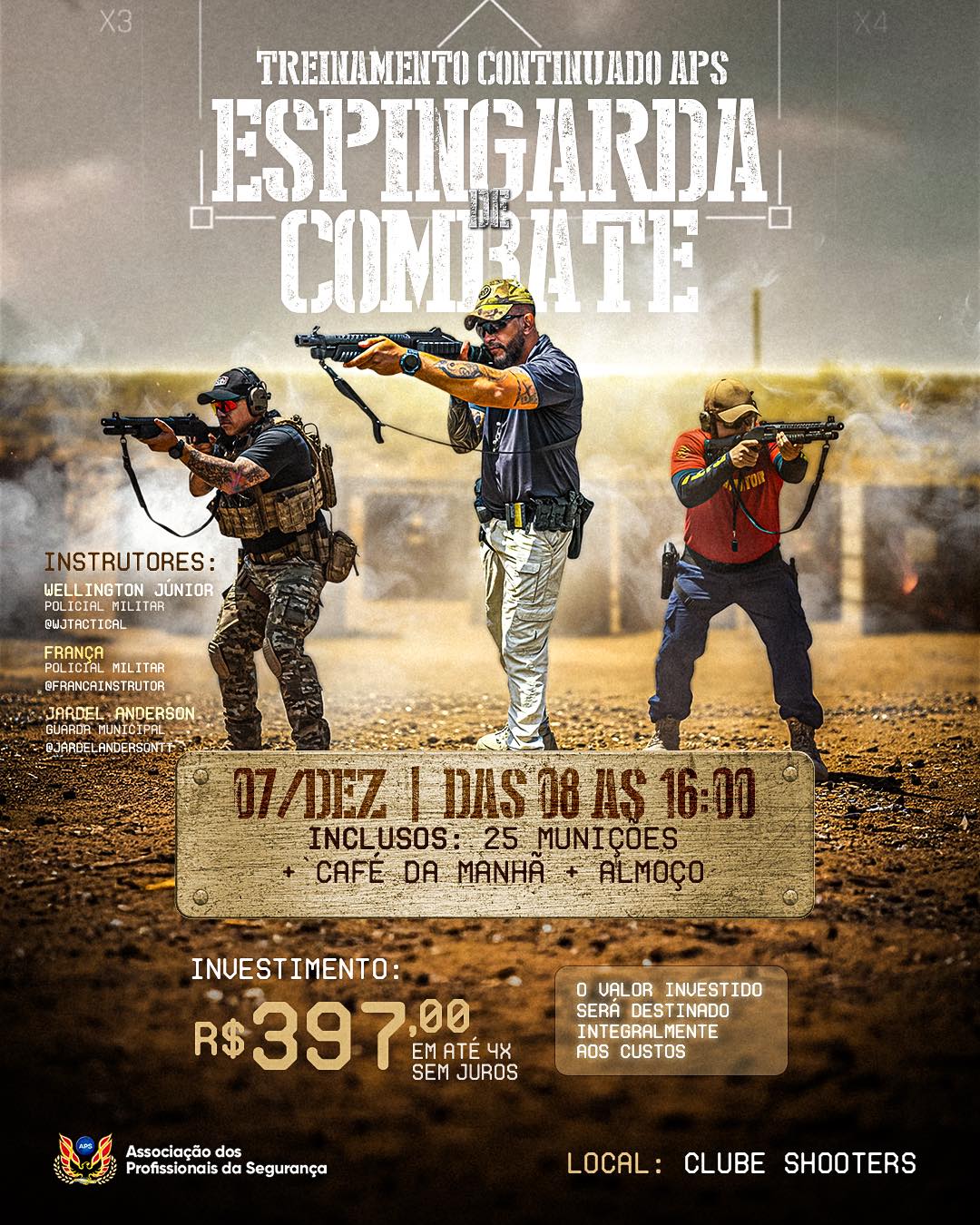 💰 Investimento: R$ 397,00 (inclui 25 munições, café da manhã, almoço e certificado). O valor é totalmente destinado aos custos do treinamento.