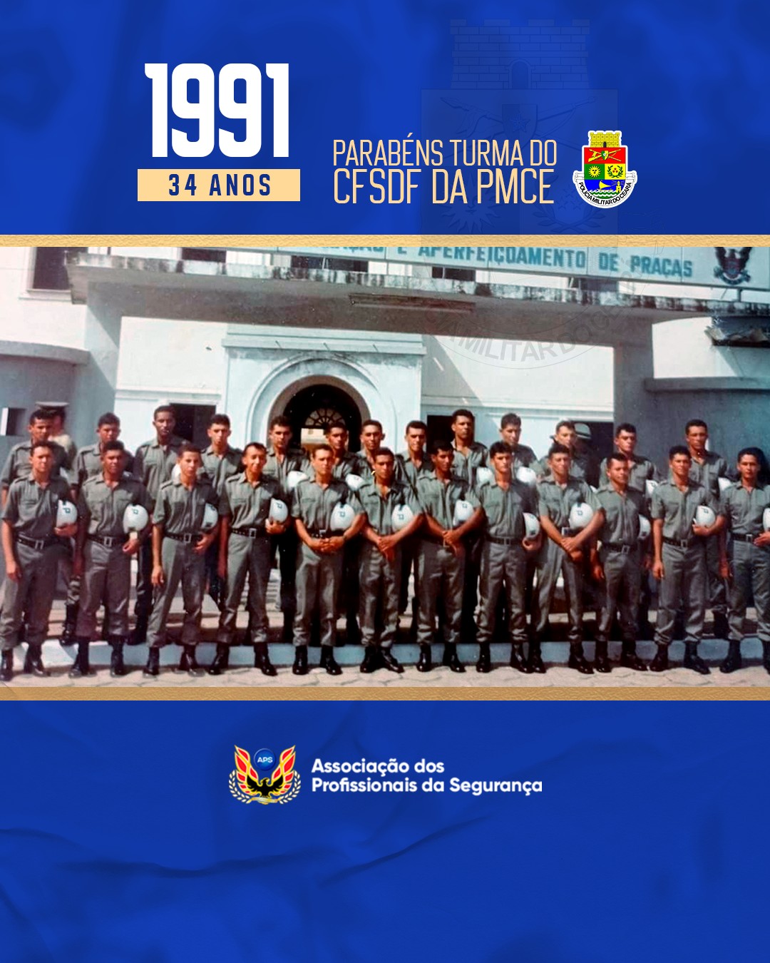 Nesta terça-feira (28), a Turma do Curso de Formação de Soldado de Fileira (CFSDF) de 1991 da Polícia Militar do Ceará (PMCE) completa 34 anos de história. Valorosos profissionais que dedicaram suas vidas à segurança do povo cearense, com honra, compromisso e bravura.